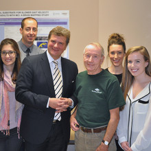 Members of the study’s research team, from left to right: Korbin Blue, Research Assistant (Co-op Student); Yanina Sarquis-Adamson, Lab Research Assistant; Frederico Faria, Post-Doctoral Fellow; Dr. Montero Odasso, Director, Gait and Brain Lab; research participant; Alanna Black, Lab Research Coordinator; Stephanie Cullen, Research Assistant (Undergraduate Student); and, Navena Lingum, Research Assistant (Master Student).
