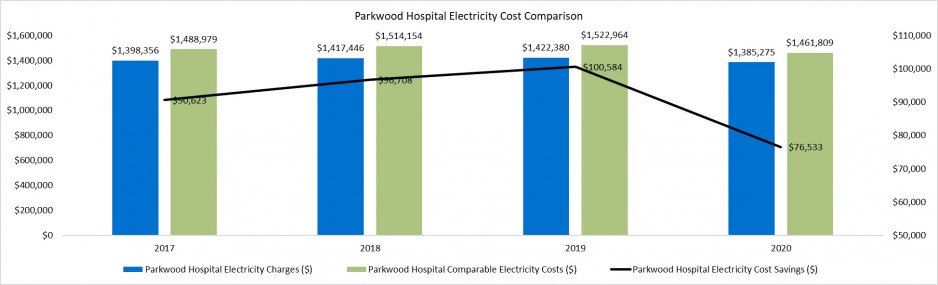 As a large electricity consumer, the St. Joseph’s Hospital site is able to participate in Ontario’s Industrial Conservation Initiative (ICI) program. The ICI program incentivizes electricity purchasers to shift their electricity consumption to off-peak hours, thereby reducing the stress to Ontario’s electricity grid caused by high peak demands, and creating a more consistent demand for electricity. This program works by allowing each customer to choose whether they would like to pay a portion of their electricity charges based on: