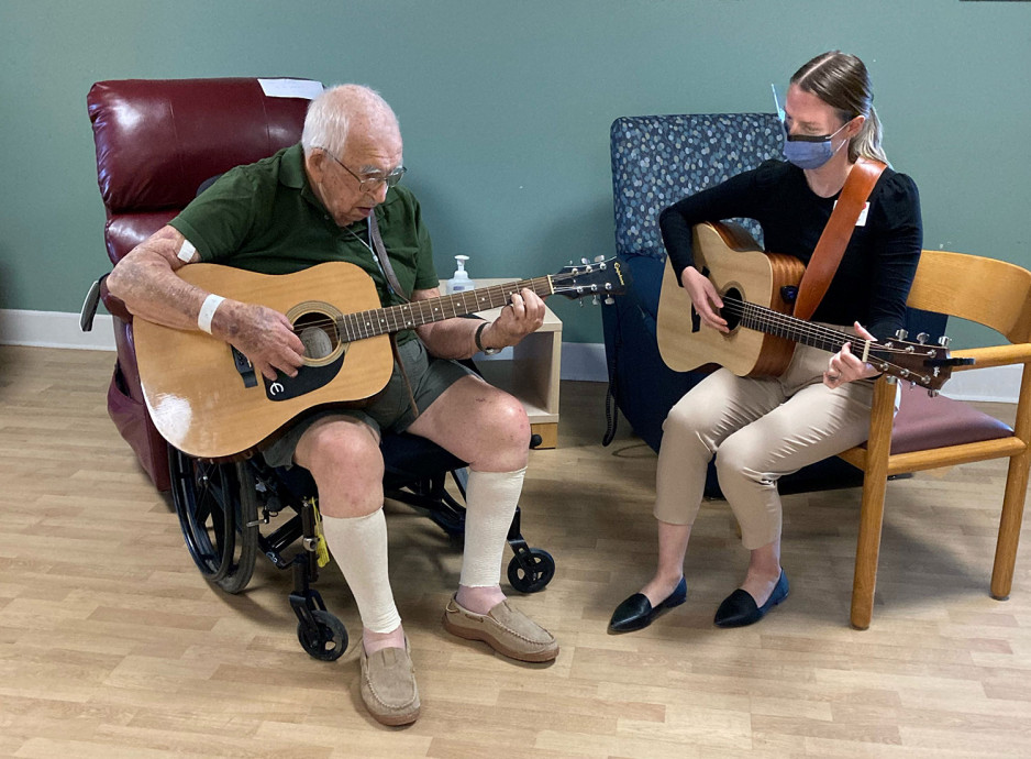 Music therapists provide the skillful use of music and musical elements to promote, maintain and restore mental, physical, emotional and spiritual health. Resident veterans explore music through singing, playing instruments, listening, improvising and movement. Music has nonverbal, creative, structural and emotional qualities. These are used in the therapeutic relationship to facilitate contact, interaction, self-awareness, learning, self-expression, communication and personal development. Music therapy groups and one-on-one sessions are held on all resident veteran units.