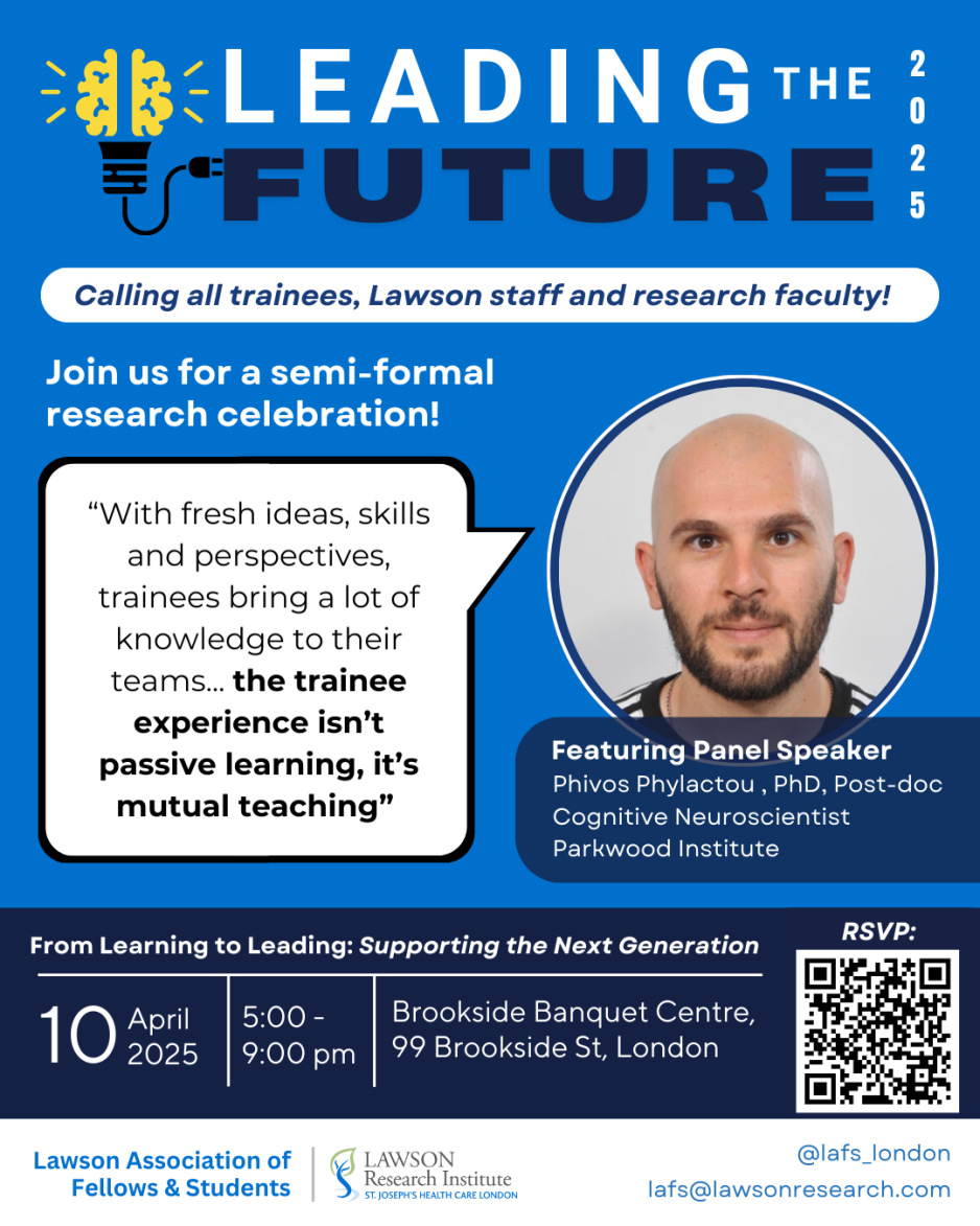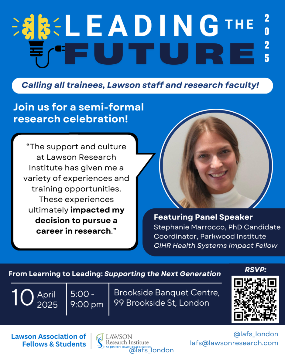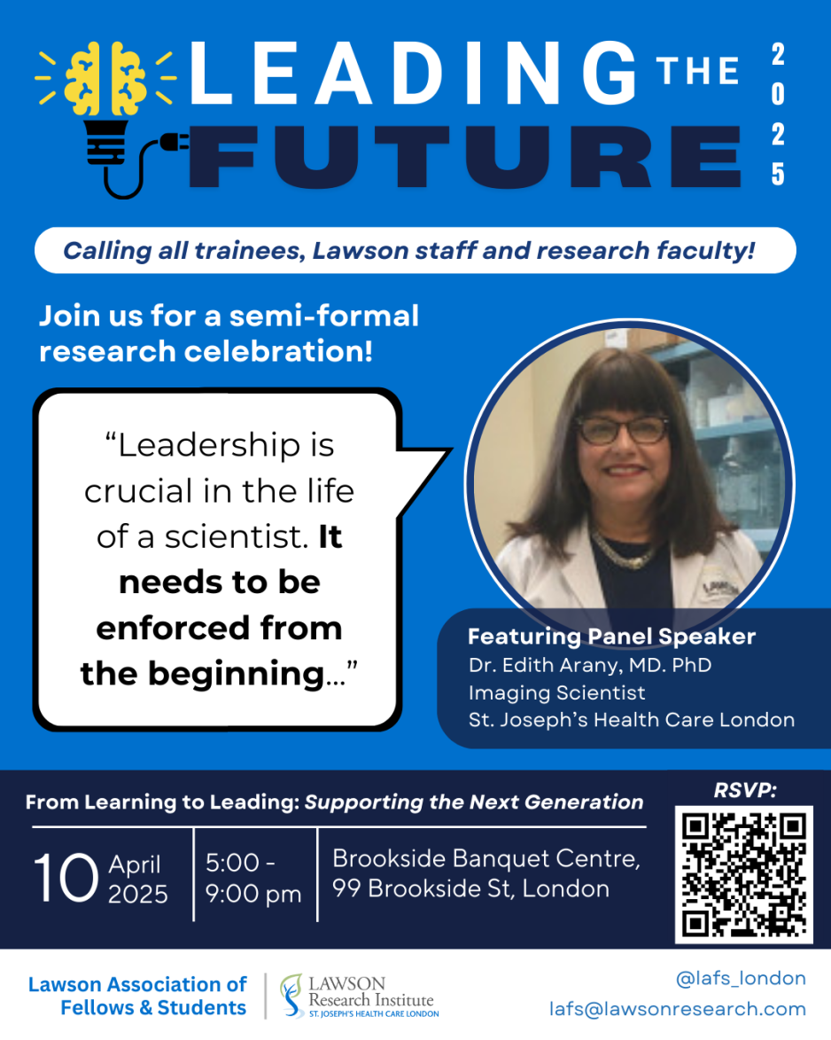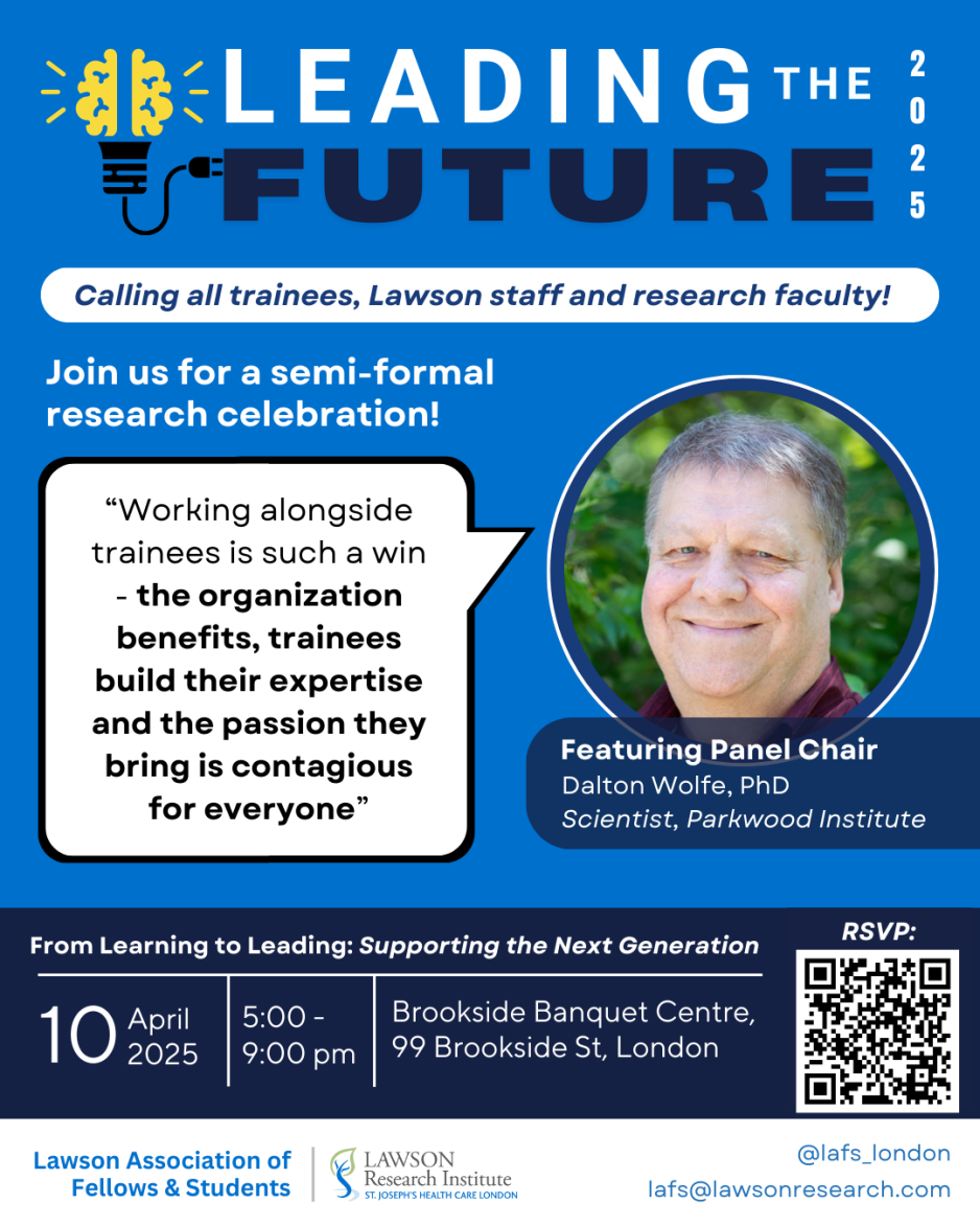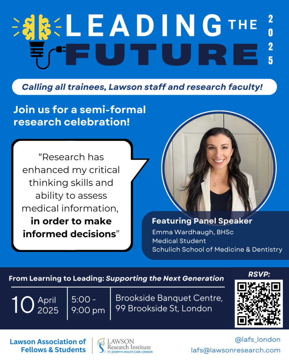 Join the Lawson Association of Fellows and Students (LAFS) for their first semi-formal event of 2025! Leading the Future aims to empower trainees to lead in research and innovation, build confidence in leaders to support trainees, and ultimately foster a collaborative environment to lead the future of the Lawson research community.