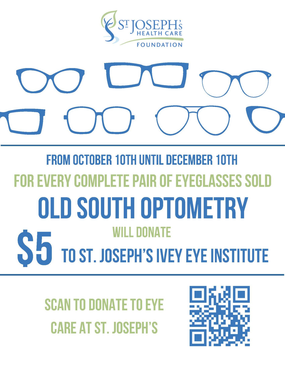For every complete pair of eyeglasses sold, Old South Optometry will donate $5 to St. Joseph’s Ivey Eye Institute.