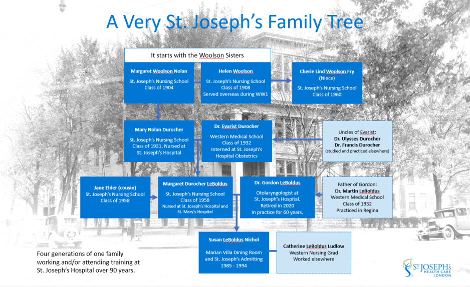One particularly leafy family tree is that of the Woolson family. It begins when two sisters, Helen and Margaret, graduated from St. Joseph’s Nursing School - Helen in 1904 and Margaret in 1908. Margaret’s daughter, Mary, followed in her mother’s footsteps, graduating in 1931, and would marry a young intern at St. Joseph’s, Dr. Evarist Durocher. Their daughter, Margaret, would also don a nursing cap at St. Joseph’s and marry a physician - otolaryngologist Dr. Gordon LeBoldus, who retired in 2020 after 60 years of practice.