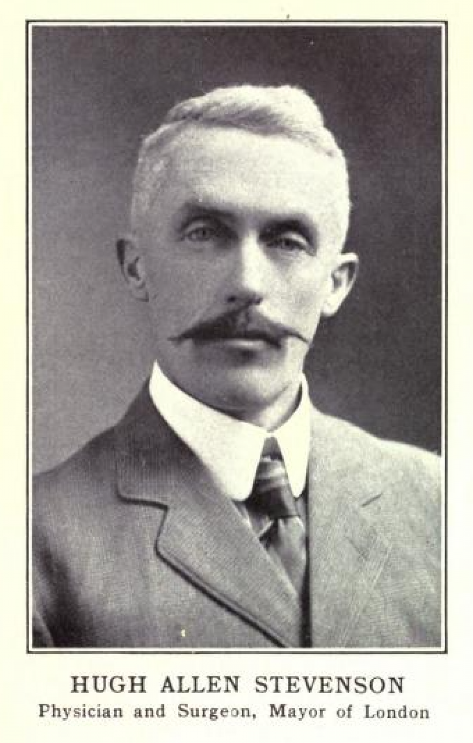 The Stevenson doctor brothers, meanwhile, were notable beyond the operating room. Both Hugh, an anesthesiologist, and William, a surgeon, were generous benefactors to St. Joseph’s Hospital and active in city politics with Hugh the Mayor of London from 1915 to 1917.