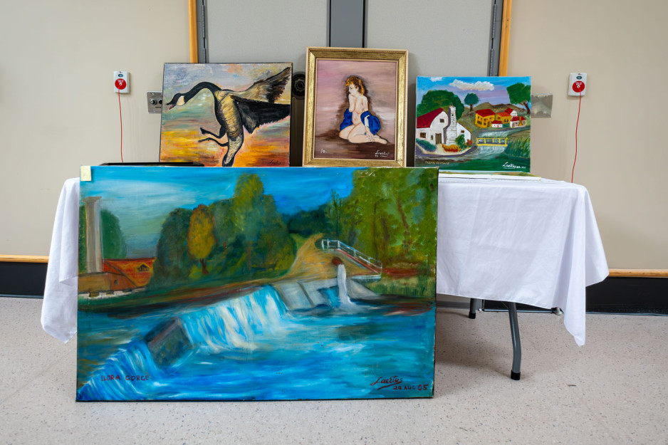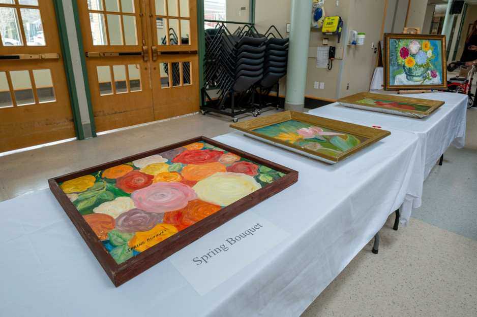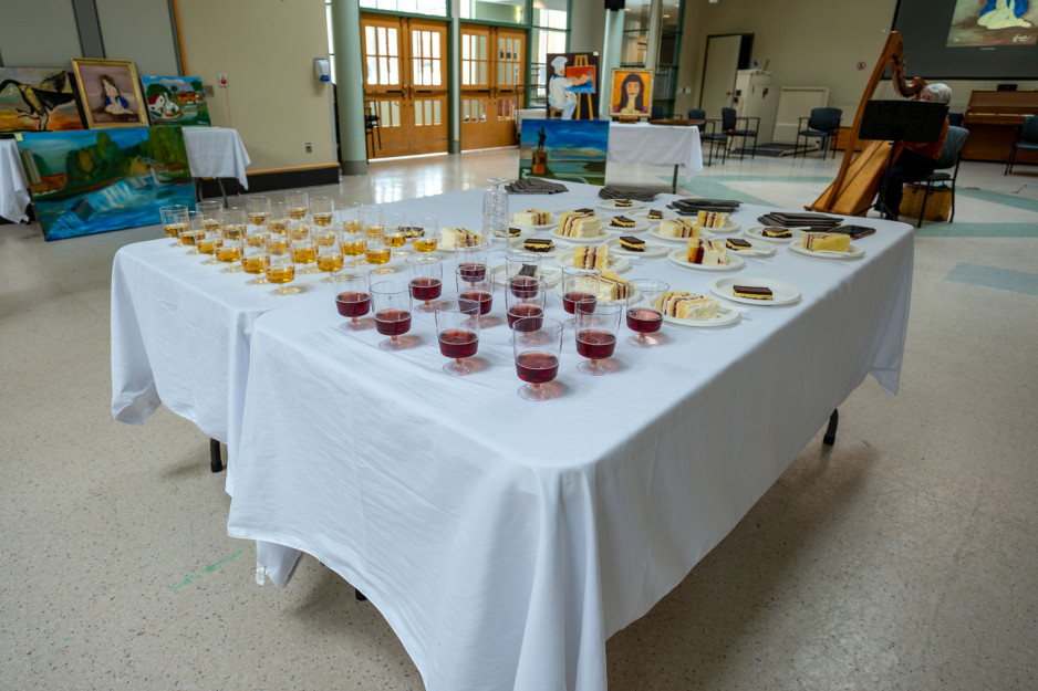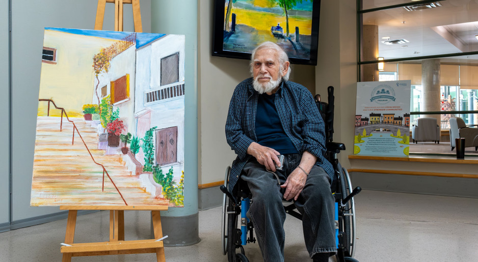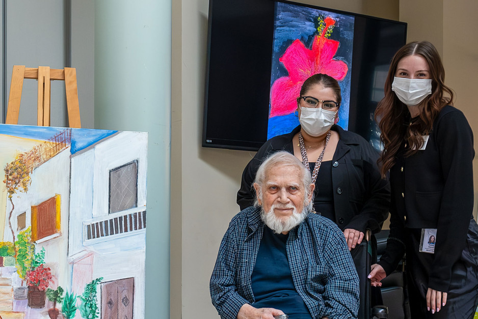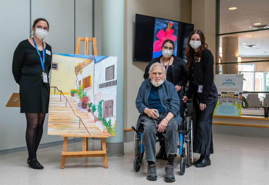 John Lartides enters a familiar room at St. Joseph’s Mount Hope Centre for Long Term Care (Mount Hope) – but this time, it feels different. The large recreation hall is now adorned with easels, decadent desserts, and a harpist who strums softly in the background. On display are beautiful pieces of artwork. This is his moment. This is his art.