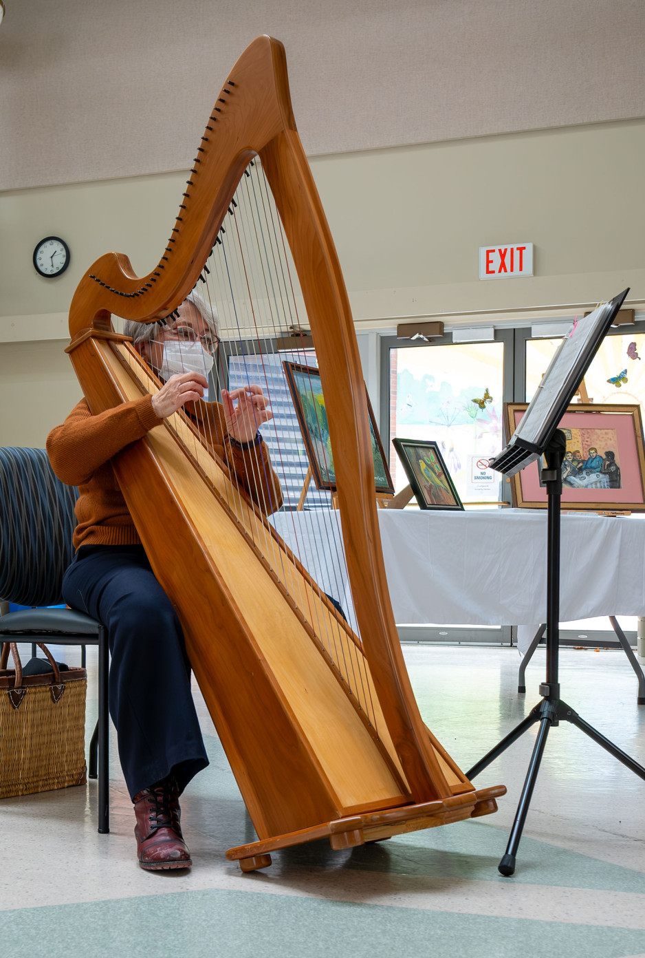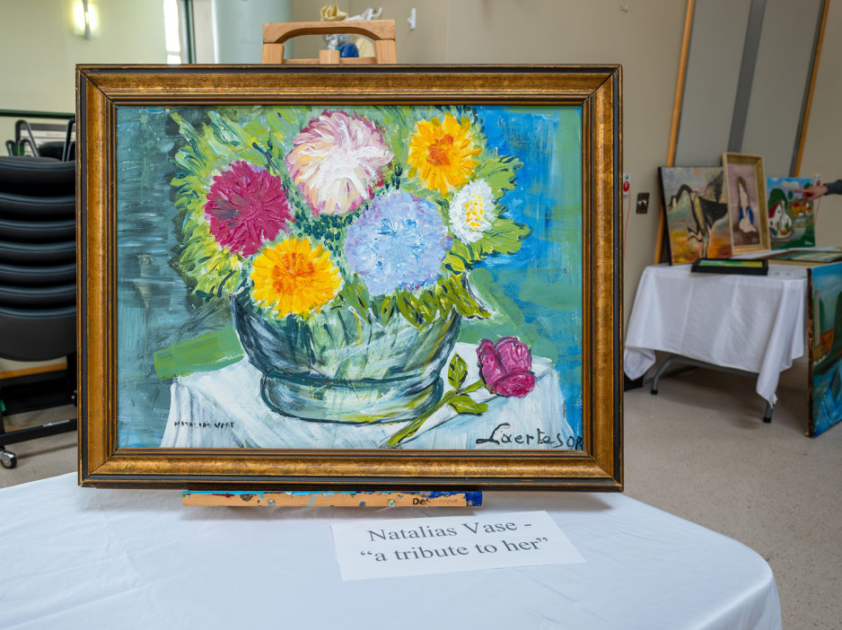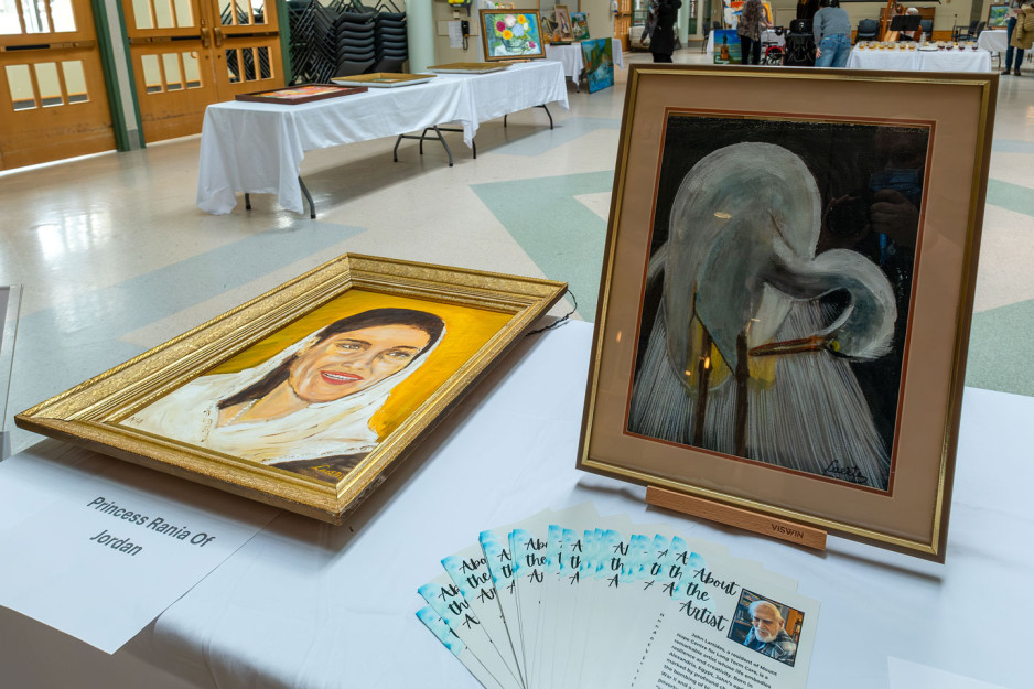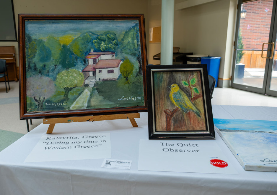 John Lartides enters a familiar room at St. Joseph’s Mount Hope Centre for Long Term Care (Mount Hope) – but this time, it feels different. The large recreation hall is now adorned with easels, decadent desserts, and a harpist who strums softly in the background. On display are beautiful pieces of artwork. This is his moment. This is his art.