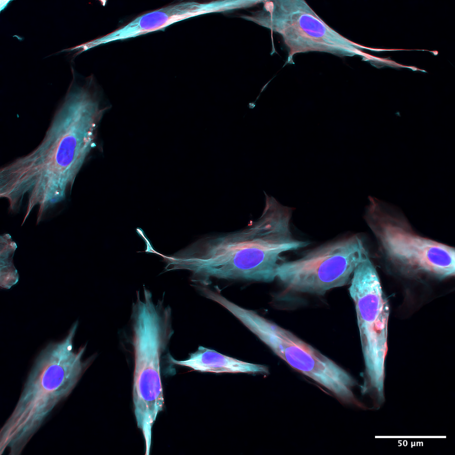 An image of fibroblast cells in a patient with Peyronie’s disease patients produced by the confocal microscope Nikon A1R. The cells' nuclei are strained with a bright deep blue fluorescent dye; the vimentin and smooth muscle actin are stained a bright turquoise and red colour, respectively.