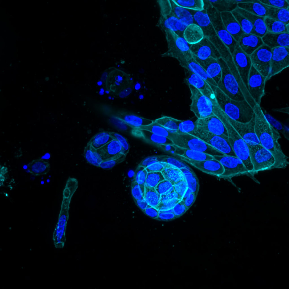An image of canine kidney epithelial cells produced by the confocal microscope Nikon A1R. The nuclei of the cells are stained with a bright blue fluorescent dye and the skeleton is stained with a bright green fluorescent dye.