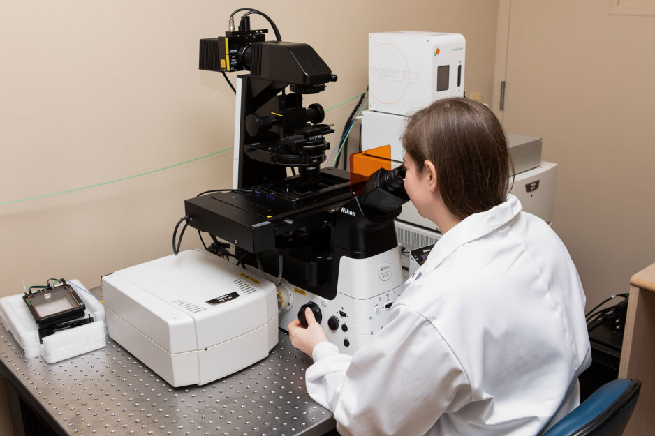 A scientist at Lawson Health Research Institute looks through the lens of the Nikon A1R confocal microscope purchased with a donation from CIBC.