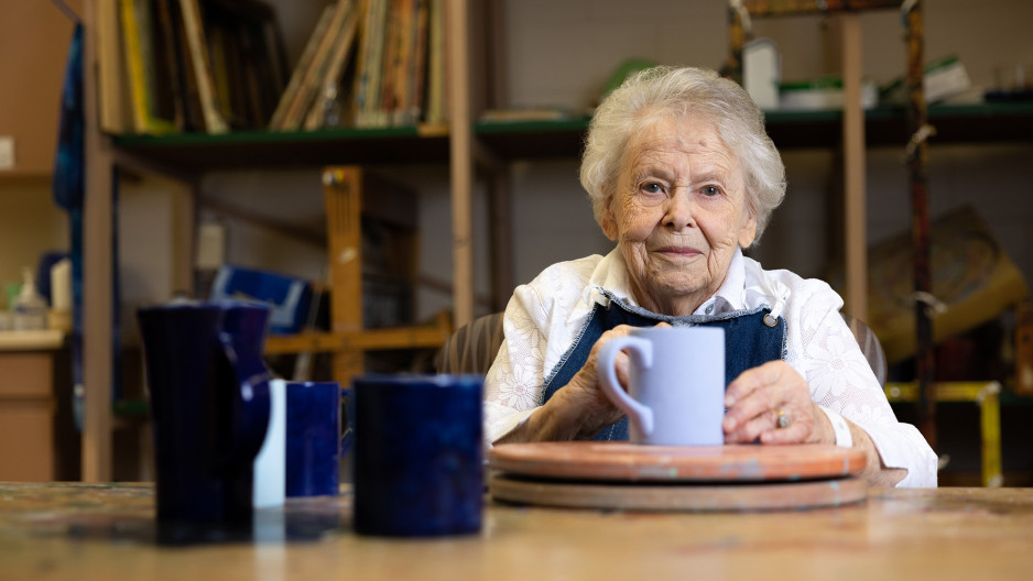 At 98, Helen keeps a busy schedule. She loves spending time in the Veterans Arts studio, knitting, painting and making toys for her grandchildren and great-grandchildren. She glows when she sees the final product.