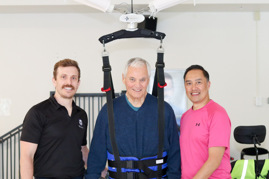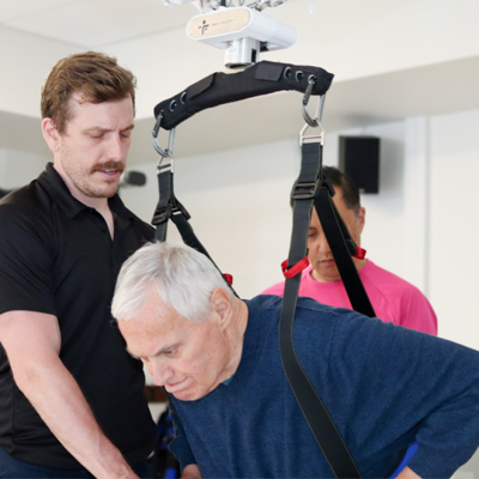 Following several months of renovations in Parkwood’s Rehabilitation Gym, the FLOAT is finally installed and already transforming care. The unrestrictive, multidirectional system provides safe rehabilitative training for patients, allowing them to be supported and if needed have their weight offloaded while wearing a harness attached to four cables and a patient bar that senses movement. It improves their balance, mobility and function, and – most importantly – boosts their confidence in their own abilities.