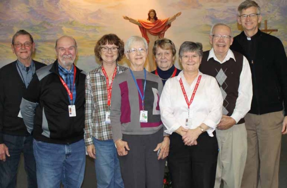 Pictured above: Some of the Mount Hope Mass volunteers, left, John Witlox, Ed Jackman, Caroline Carbone, Ann Cromie, Ellenor Castle, Lois Martin, Yvon Bergeron with Fr. Peter Poel. This dedicated group of volunteers ensures residents have the opportunity to stay close to God while in care.