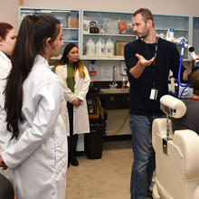 Above: Dr. Sebastien Villard (second from right) and Michael Corbacio (far right) provide a demonstration of research being conducted in Dr. Alexandre Legros' Bioelectromagnetics and Human Threshold Research Group